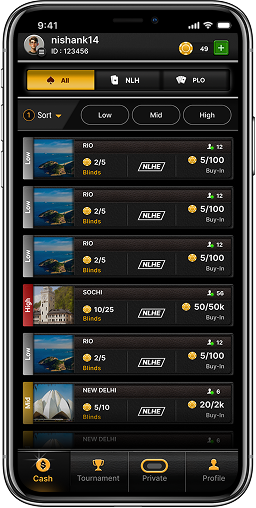 10+ poker variants including Texas Hold'em, Omaha, OFC, and more.